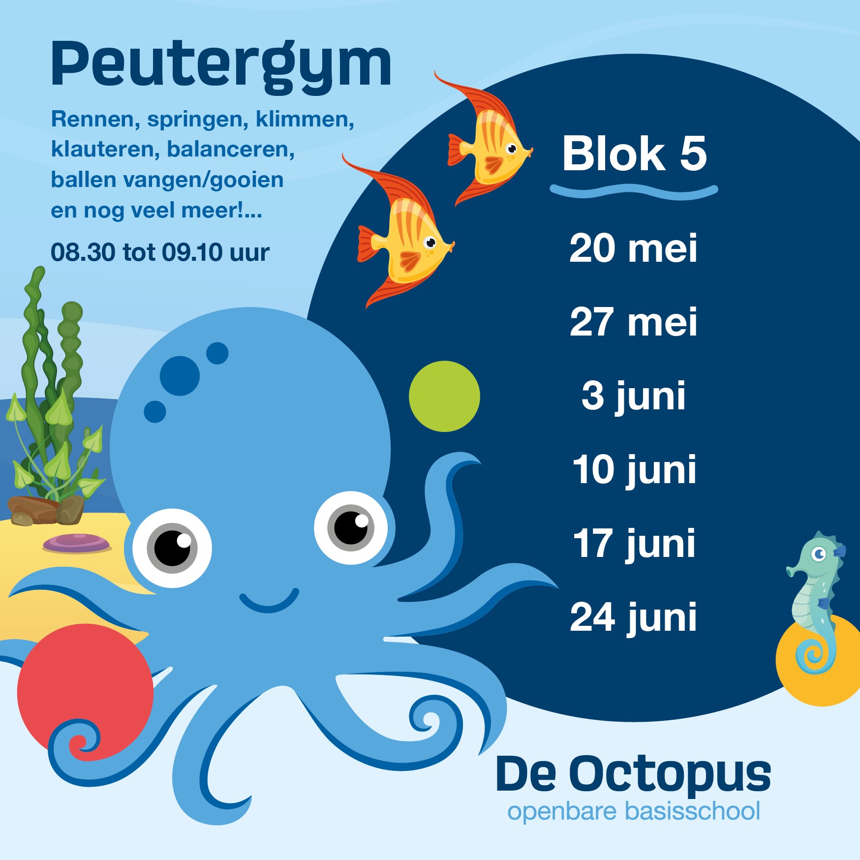 De peutergym wordt op woensdagochtend van 8.30 tot 9.10 uur gegeven in het speellokaal van OBS de Octopus. De les wordt gegeven door onze gymdocent, Laura Spijkerboer.